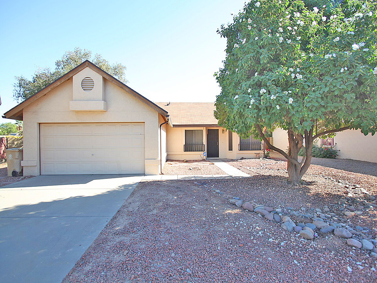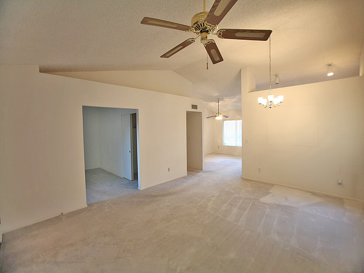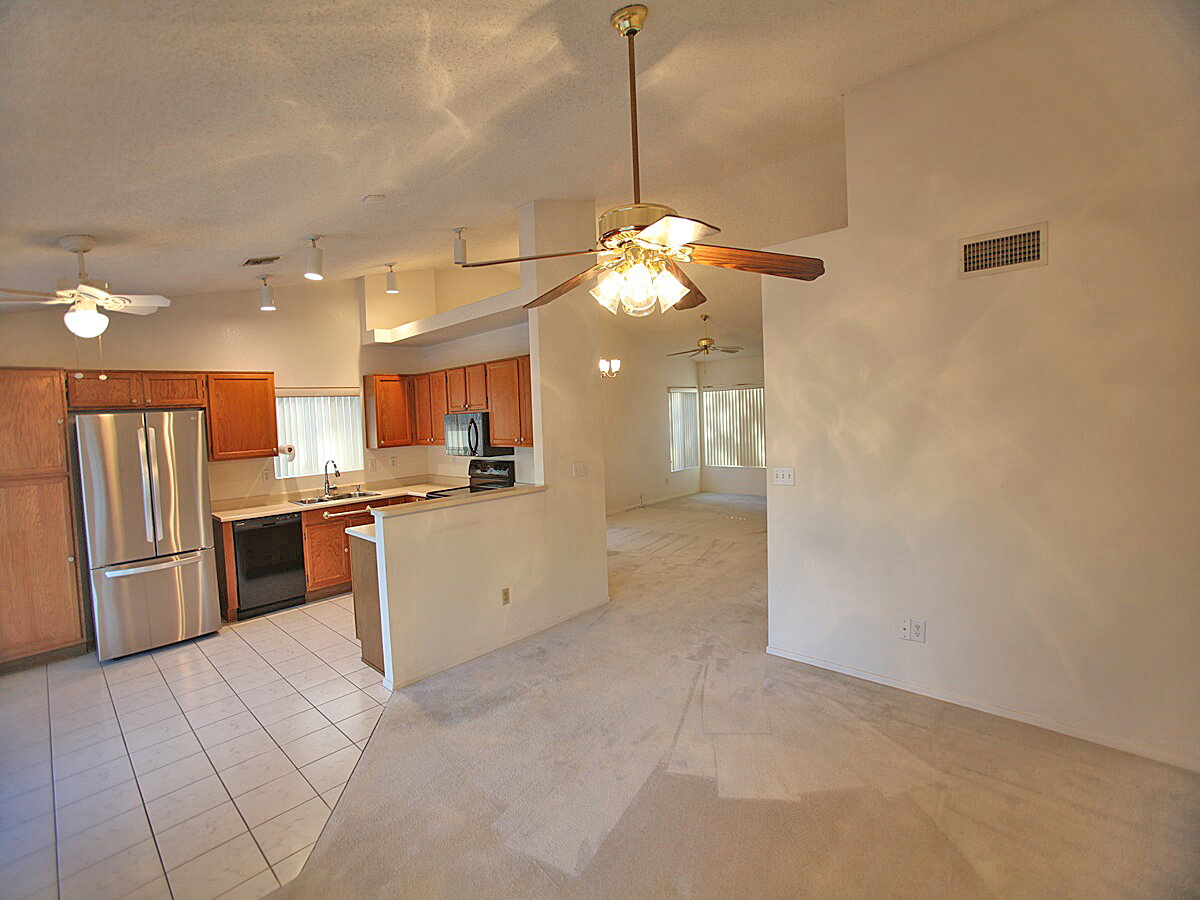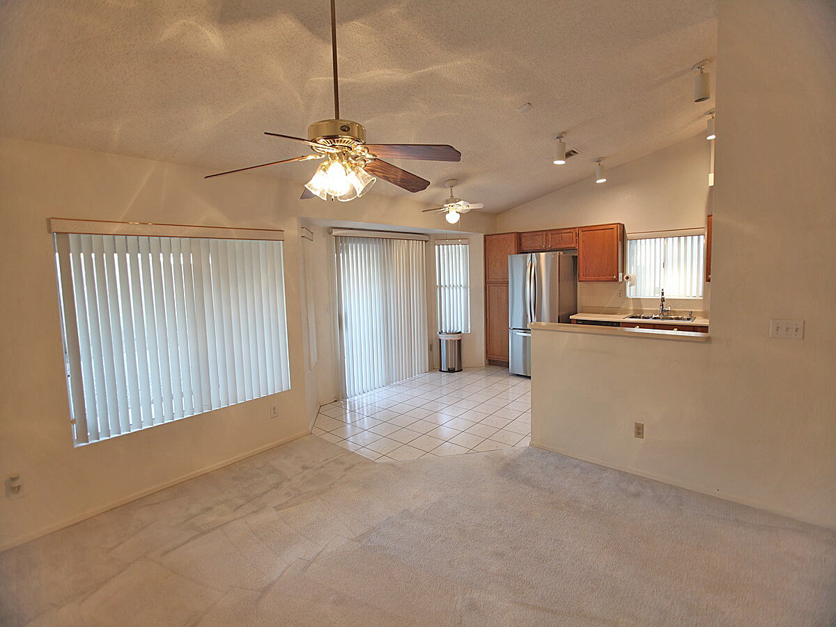 Tour this inviting 3-bedroom + Den, 2-bathroom home with all appliances included! The spacious living area features vaulted ceilings that create an open, airy feel. The kitchen comes equipped with a refrigerator, dishwasher, microwave, and stove, plus a washer and dryer for added convenience. The master suite includes dual closets and an ensuite bathroom with dual vanity sinks. Relax and entertain on the extended covered patio in the backyard. Schools close by. Don't miss this opportunity—schedule your showing today!
