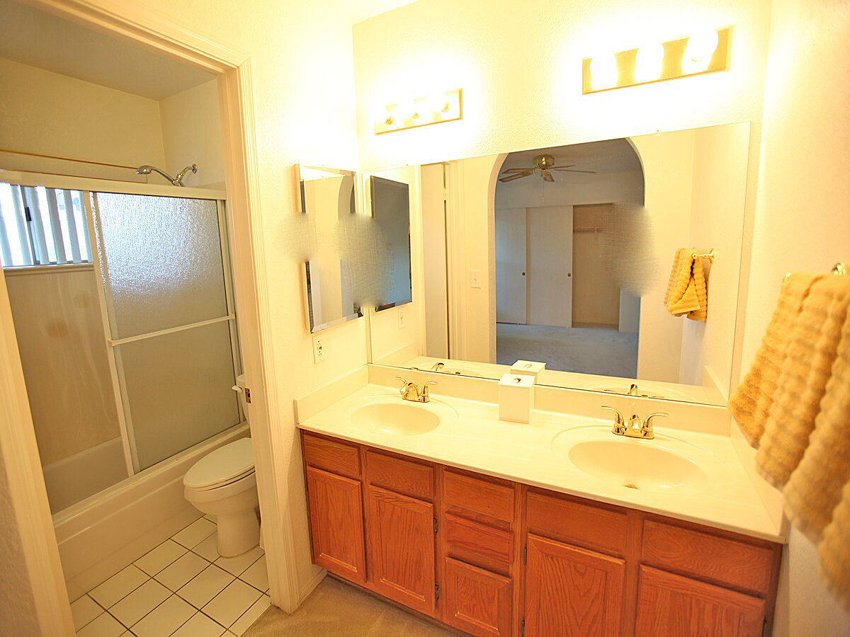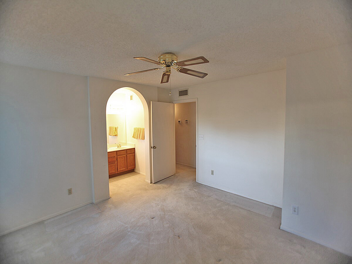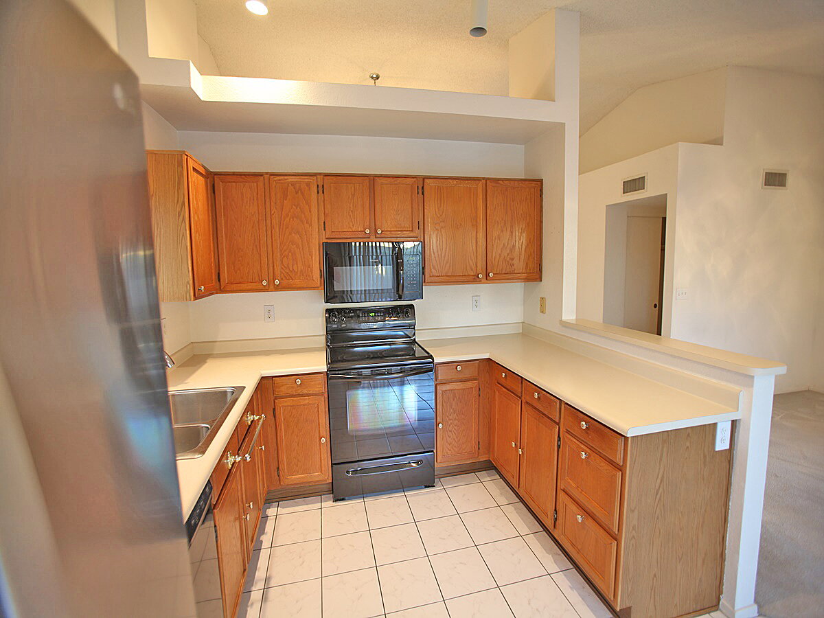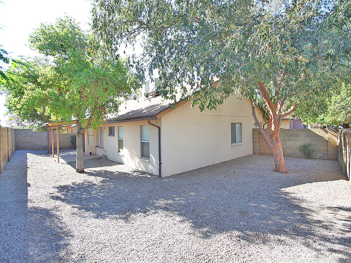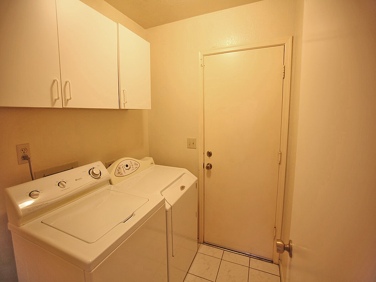 Tour this inviting 3-bedroom + Den, 2-bathroom home with all appliances included! The spacious living area features vaulted ceilings that create an open, airy feel. The kitchen comes equipped with a refrigerator, dishwasher, microwave, and stove, plus a washer and dryer for added convenience. The master suite includes dual closets and an ensuite bathroom with dual vanity sinks. Relax and entertain on the extended covered patio in the backyard. Schools close by. Don't miss this opportunity—schedule your showing today!