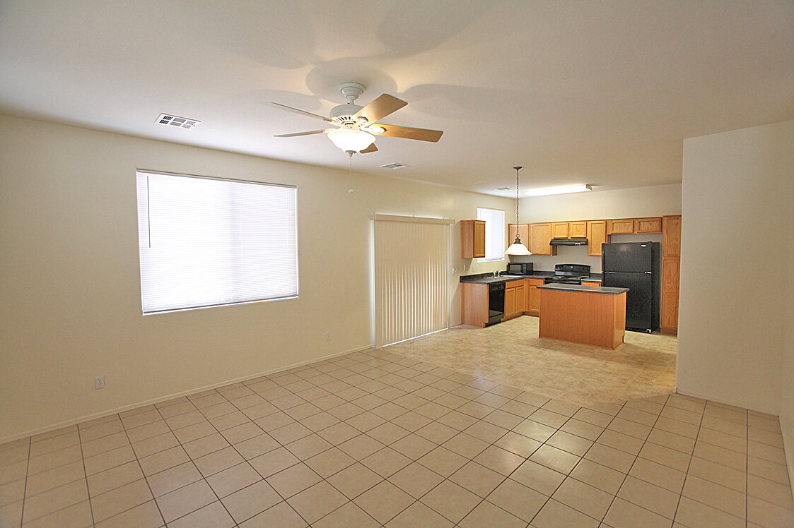 3 bed + 2.5 bath home in Surprise has a large open great room, Island Kitchen with refrigerator, range, dishwasher, and microwave. Large master suite with sitting area, and walk-in closet. Washer and Dryer also included. Landscaping service of the front yard is included twice per month! Sorry, no pets