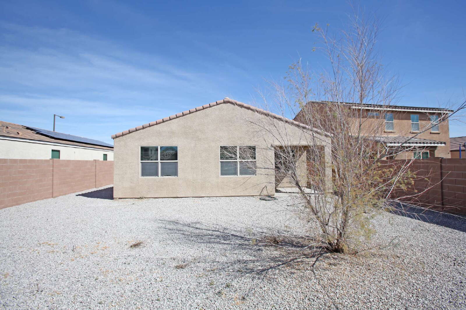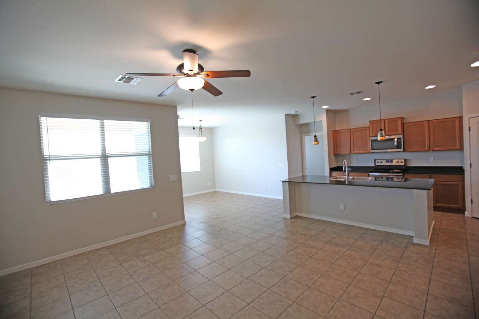 3 Bedroom + 2 Bathroom home. Kitchen features granite counters, pendant lights, stainless steel appliances, including the refrigerator, stove/range, dishwasher and built-in microwave. Included is dining in the the living room/great room as well as a breakfast bar. The master suite features dual sinks plus a large walk in closet. The washer and dryer are also included. This appealing home has a 2 car garage, easily maintained desert landscaped back yard and covered patio. Ceiling fans and blinds throughout.