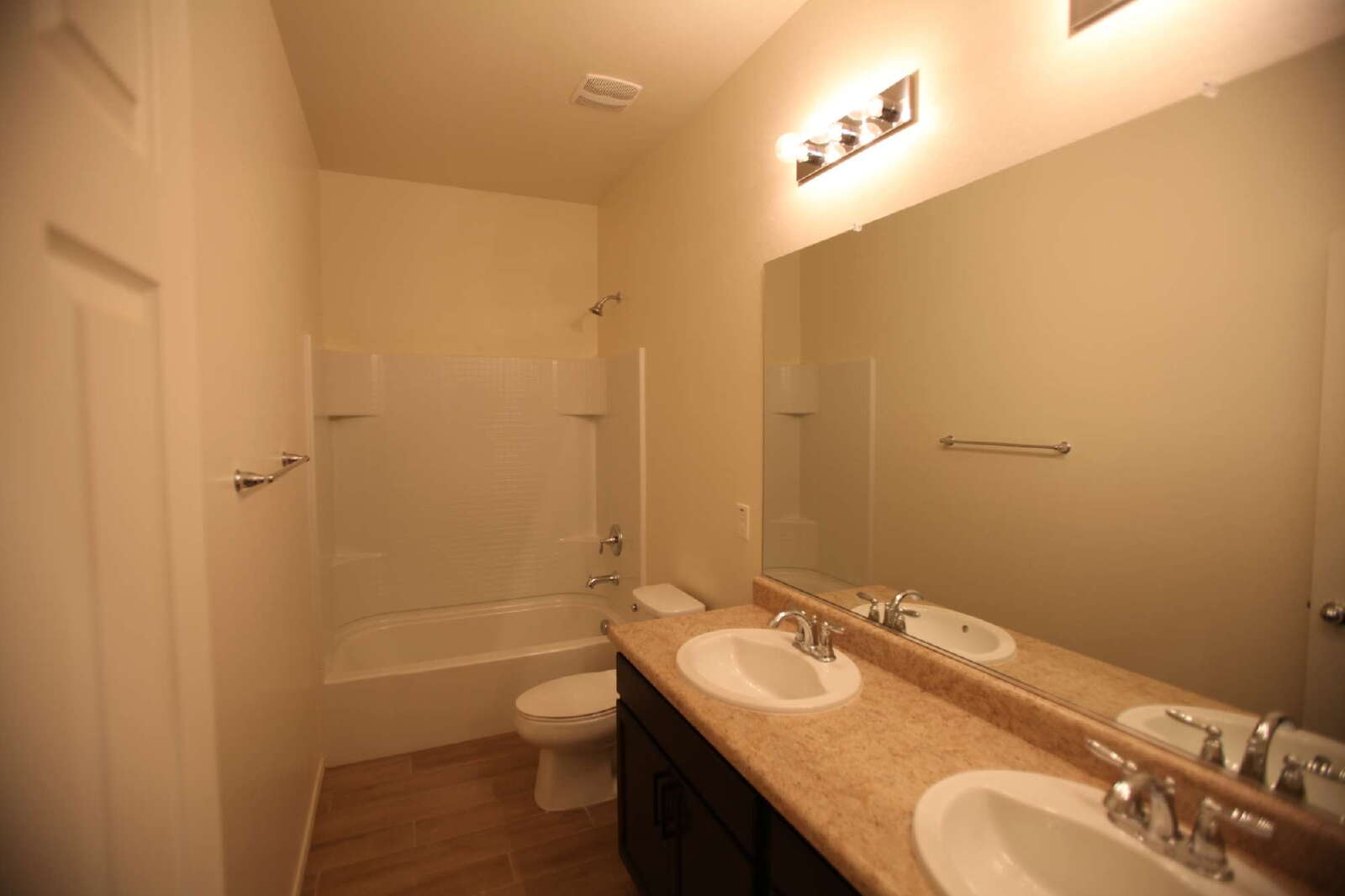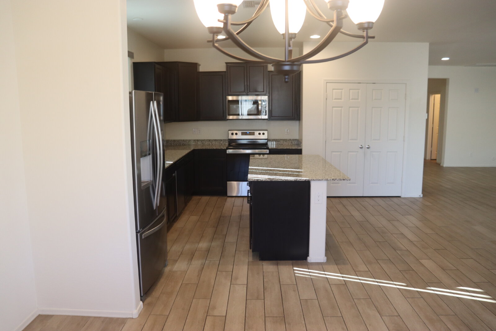 Beautiful 4 bedroom, 2.5 bathroom home. The kitchen boasts a huge granite island for a beautiful presentation for any occasion, 42'' staggered cabinets proudly displayed throughout the kitchen, and a double door pantry for ample storage. The great room overlooks the patio, with a N/S facing view. The master bedroom is spacious and peaceful, and offers privacy from the guest rooms. The glass walk-in shower and double sinks sit perfectly next to the large, open master closet. The wood-plank tile lays beautifully throughout the home; offering carpet only in the bedrooms.