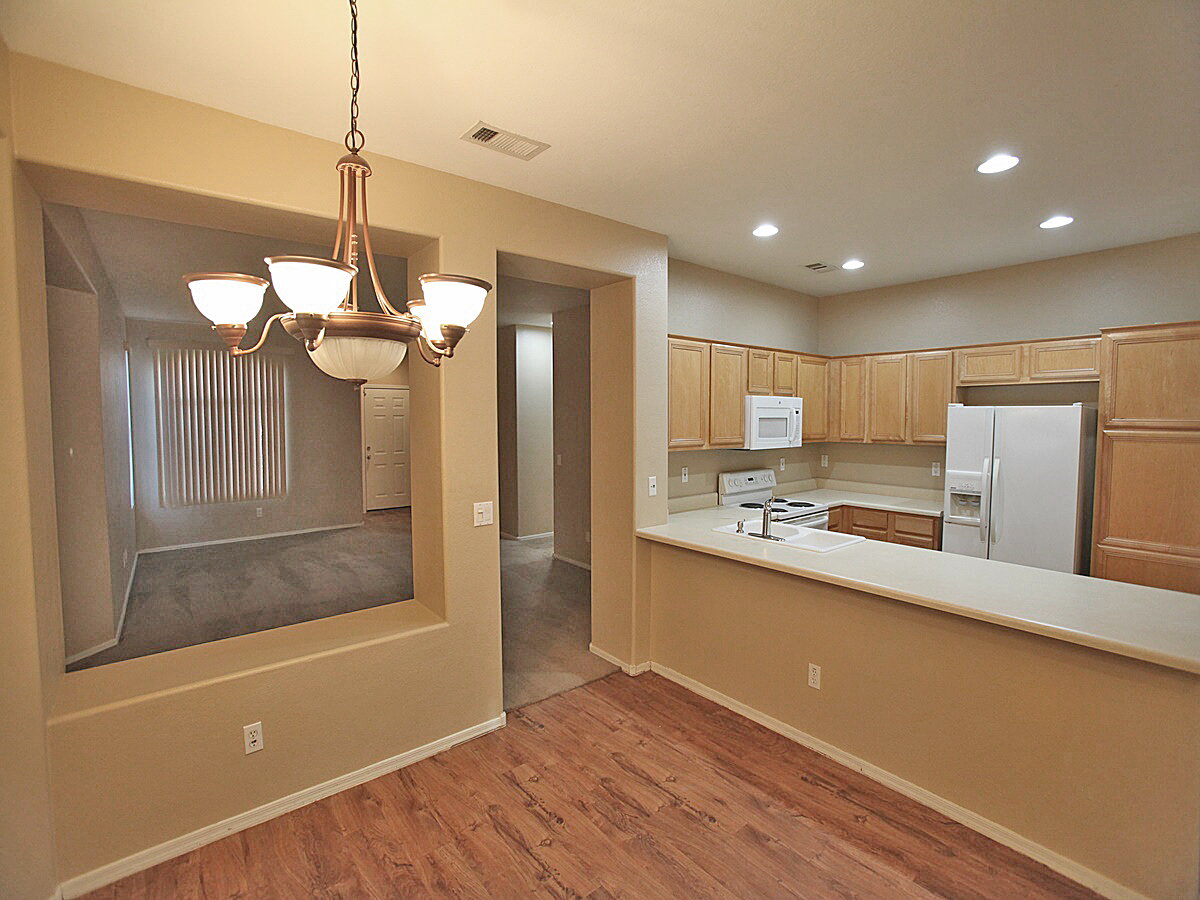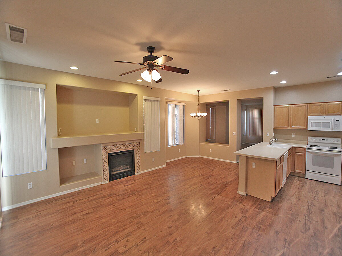 Charming 3-bedroom, 2-bath home with a spacious kitchen featuring a snack bar, built-in microwave, and refrigerator. Enjoy a cozy family room with a fireplace, plus formal living and dining spaces. The primary suite includes a walk-in closet and a bath with separate shower, tub, and double-sink vanity. Outdoors features a covered patio with extended slab, grassy front and back yards, and a 2-car garage. APPLY NOW!